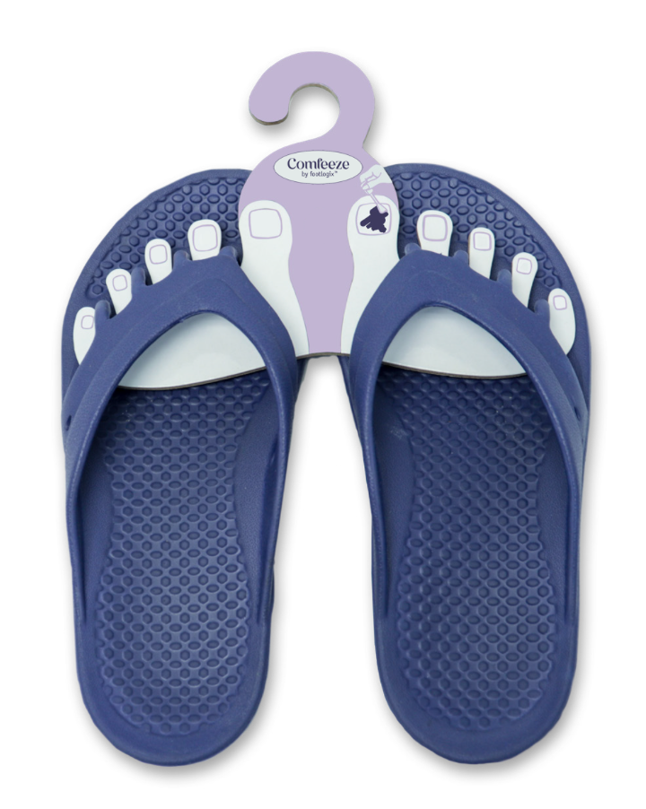 Comfeeze by Footlogix™ sandals feature a unique five-toe separator that helps provide exceptional arch support and a deep heel cup, promoting improved foot and toe alignment for better balance and stability. These recovery sandals help prevent tired and aching legs and support enhanced blood flow and circulation. Comfeeze by Footlogix™ sandals are perfect for technicians, ensuring even toe separation for flawless polish application. Made with a durable, waterproof, easy to clean material, these sandals feature a non-skid sole and provide comfort for all day wear.